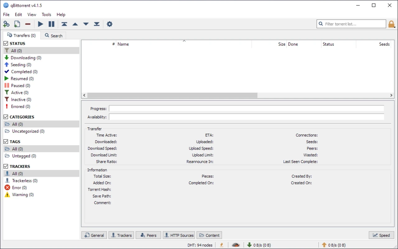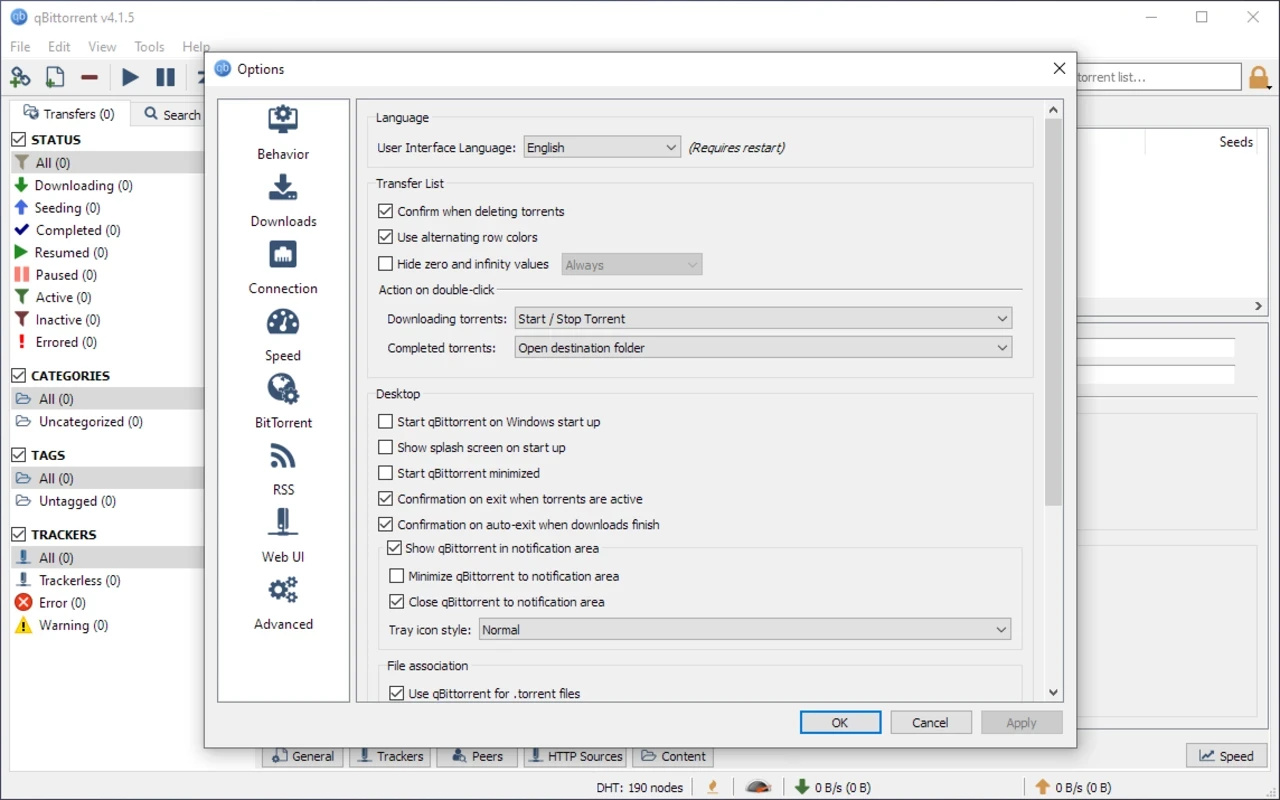 这款软件界面简洁友好,外观与 uTorrent 类似,都带有标志性的顶部工具栏。它配备了多种功能,例如添加种子链接、添加种子文件、删除、恢复、暂停和设置。设置菜单中包含了所有常用选项,并通过相应的图标清晰地标识出来。